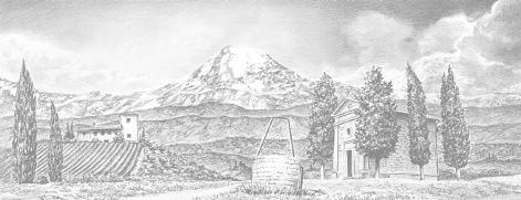 La ilustración refleja el paisaje de la Toscana, el entorno de la Cappella della Madonna di Vitaleta en Val d’Orcia, Siena, y detrás, el imponente volcán Tupungato en Mendoza. Representa los orígenes y lugar de donde vinieron nuestros antepasados, y a donde llegaron.